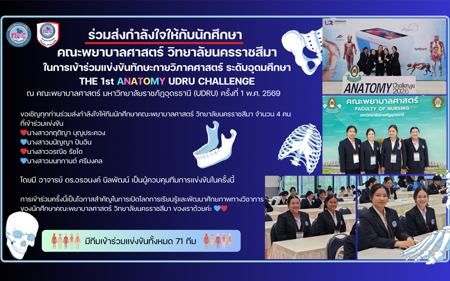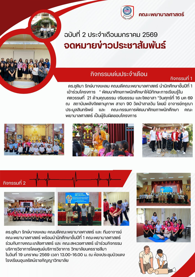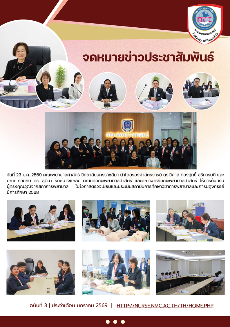 วันที่ 23 ม.ค. 2569 คณะพยาบาลศาสตร์ วิทยาลัยนครราชสีมา นำ โดยรองศาสตรจารย์ ดร.วิภาส ทองสุทธิ์ อธิการบดี และคณะ ร่วมกับ ดร. ชุติมา รักษ์บางแหลม คณบดีคณะพยาบาลศาสตร์ และคณาจารย์คณะพยาบาลศาสตร์ ให้การต้อนรับ ผู้ทรงคุณวุฒิจากสภาการพยาบาล ในโอกาสตรวจเยี่ยมแล