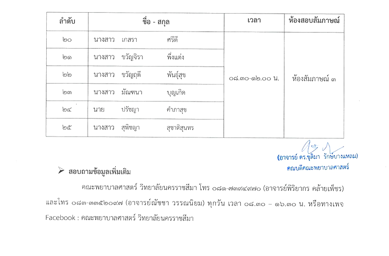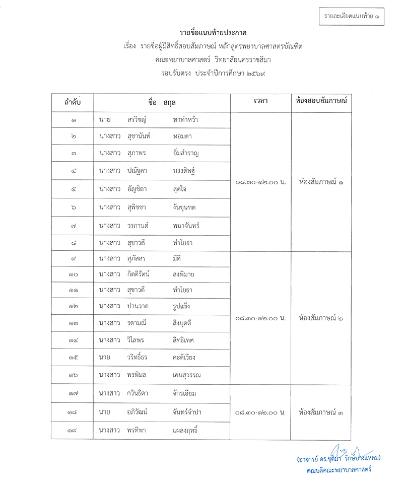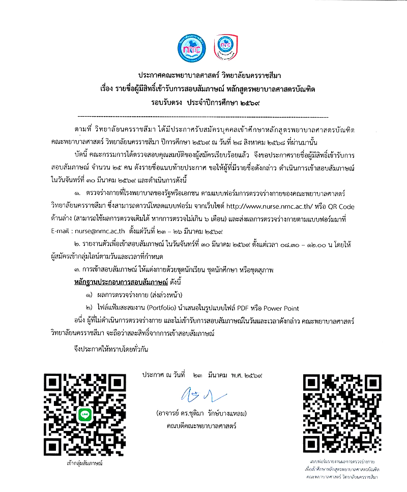 ประกาศรายชื่อผู้มีสิทธิ์เข้ารับการสัมภาษณ์ หลักสูตรพยาบาลศาสตรบัณฑิต คณะพยาบาลศาสตร์ ปีการศึกษา 2569 ( รับตรงรอบ 2)