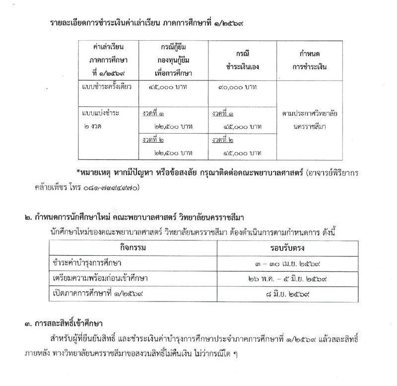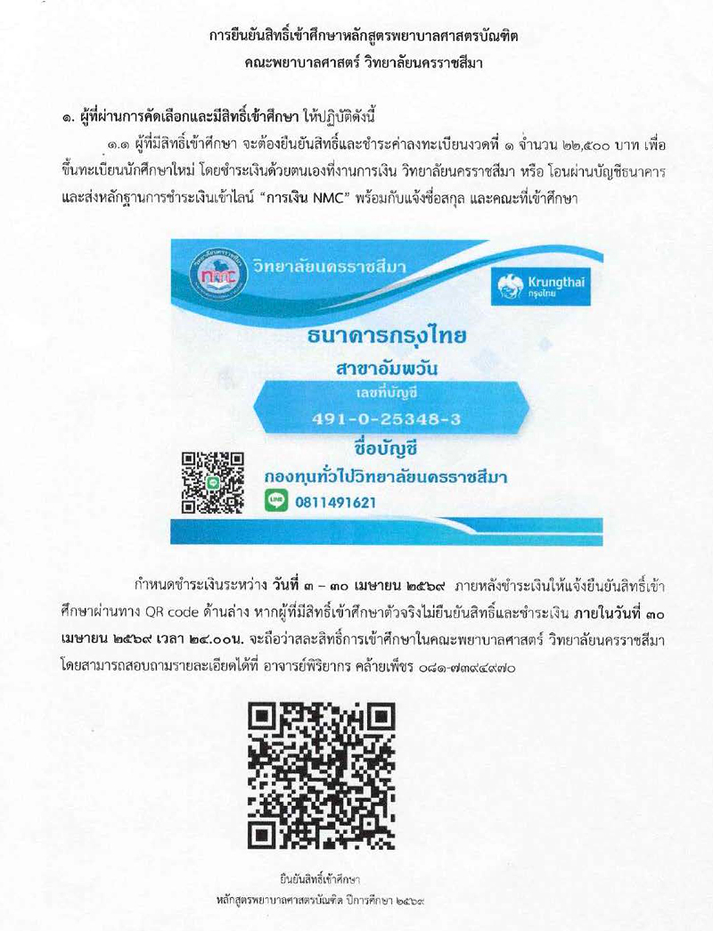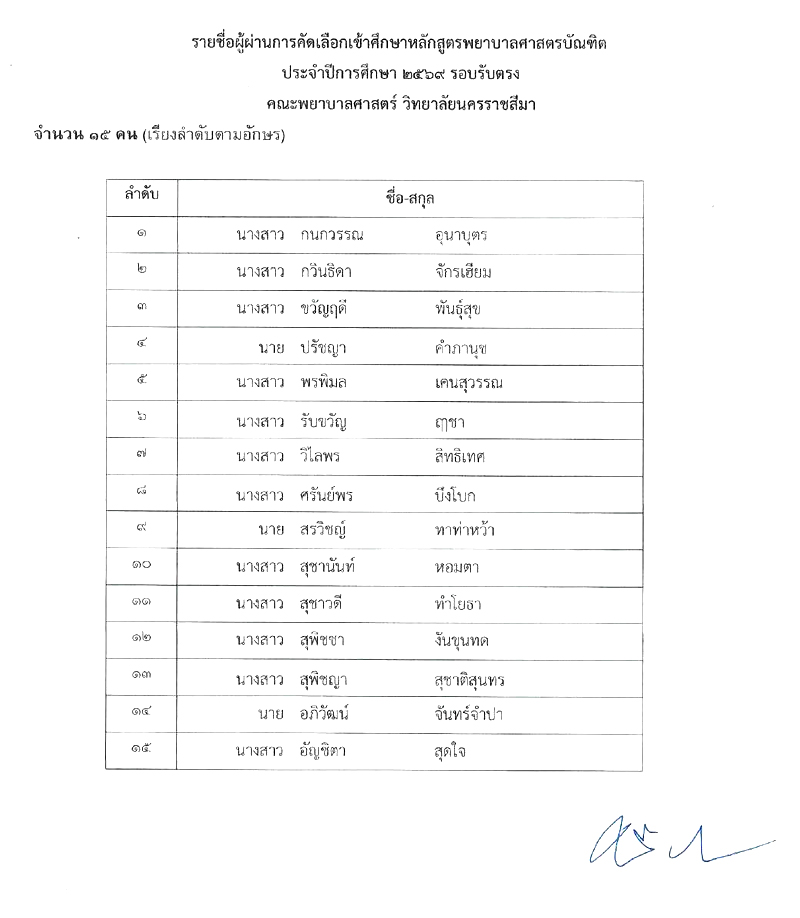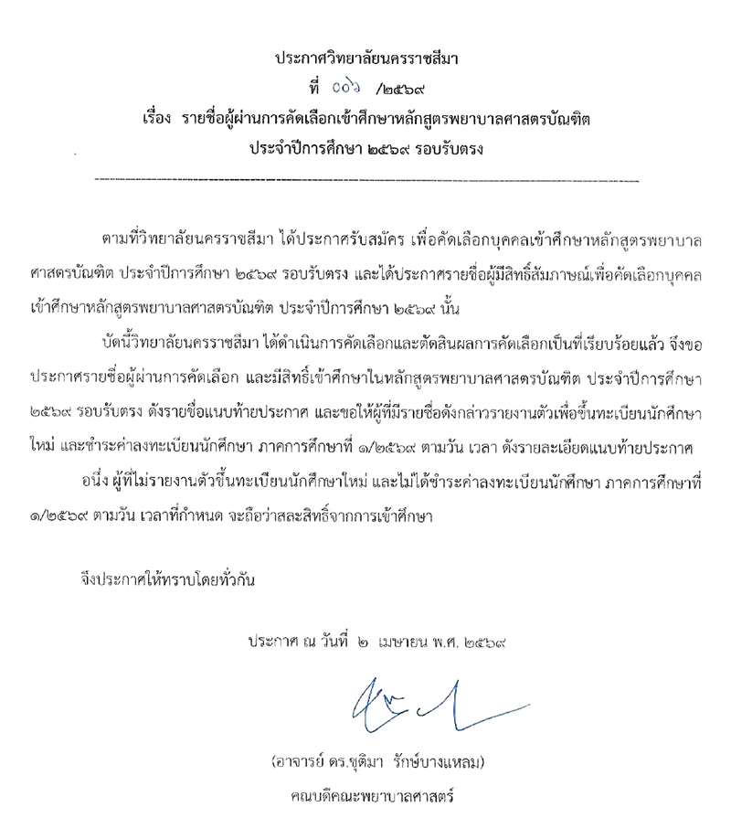 ประกาศรายชื่อผู้ผ่านการคัดเลือกเข้าศึกษาหลักสูตรพยาบาลศาสตรบัณฑิต คณะพยาบาลศาสตร์ ประจำปีการศึกษา ๒๕๖๙ รอบรับตรง